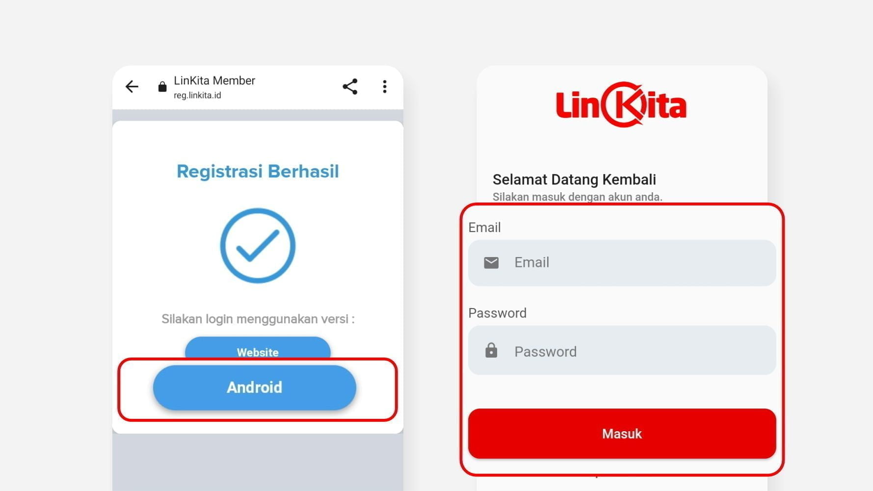 Jika pembuatan password Anda berhasil, maka anda akan di arahkan untuk login. Silahkan pilih tombol Android untuk masuk ke aplikasi dan masukkan email serta password yang sudah Anda buat tadi.
